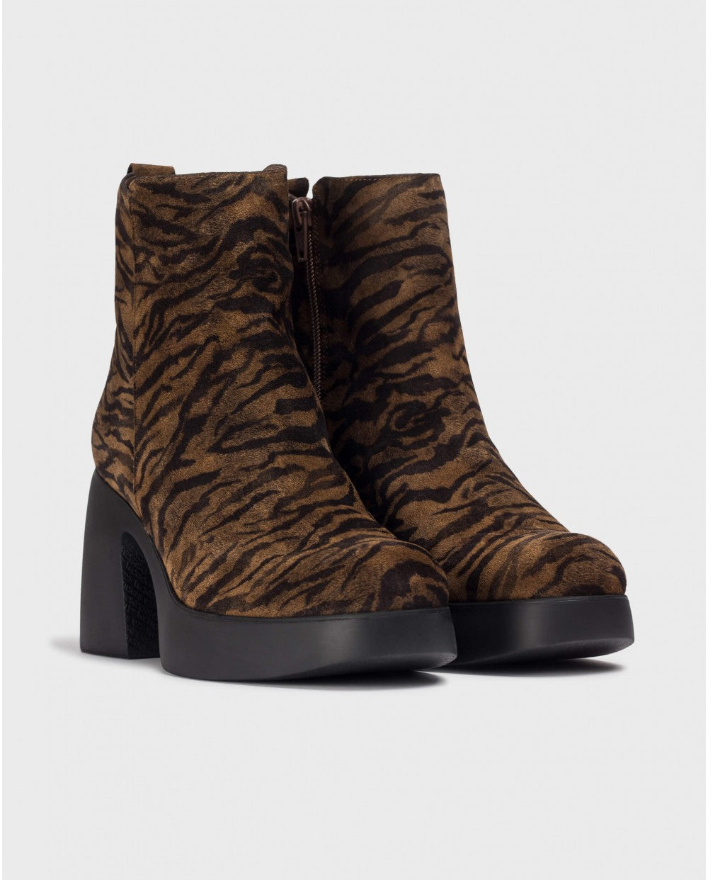 Zebra print ankle boot in brown suede. The platform sole developed with Wondersfly technology ensures lightness and flexibility. The memory gel insole offers superior comfort.