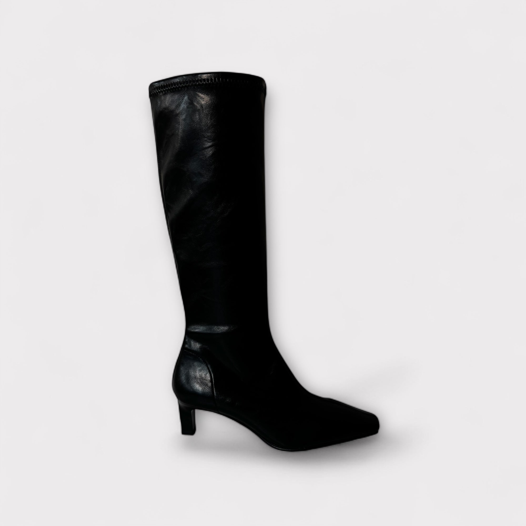 Black knee high leather look, stretch pull on boot. Low heel, pointed square toe.