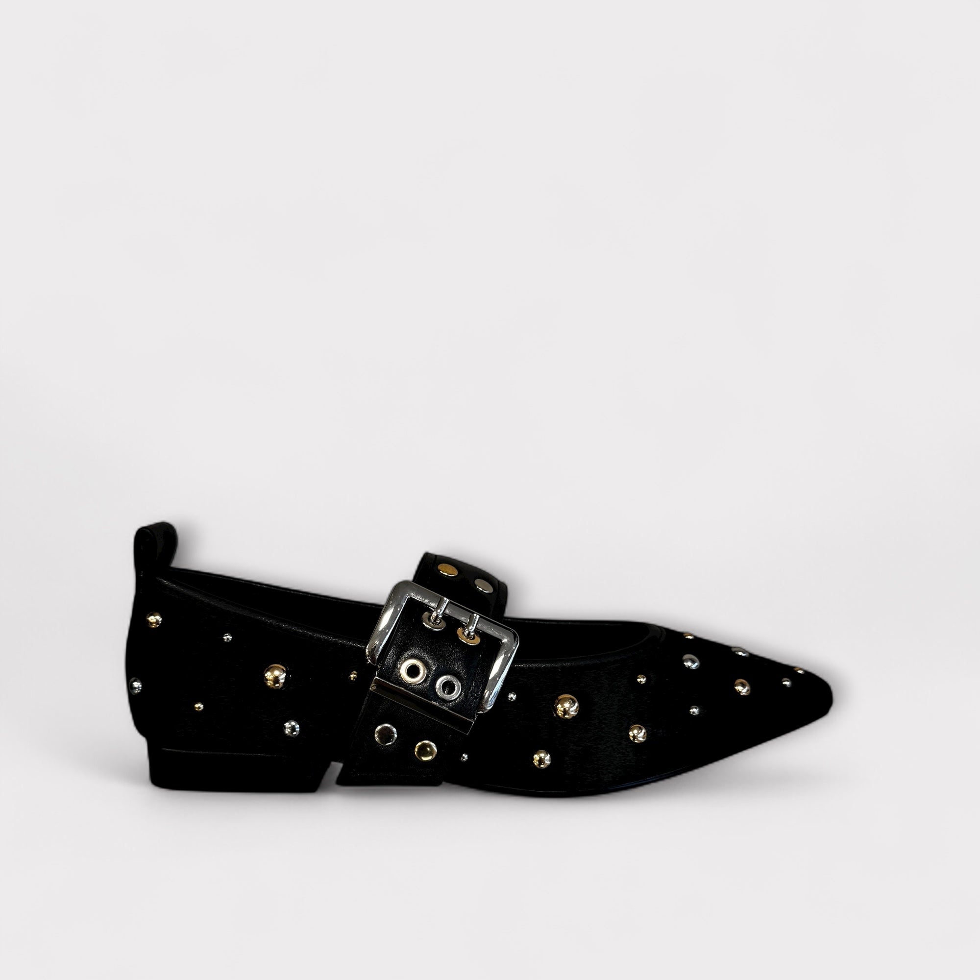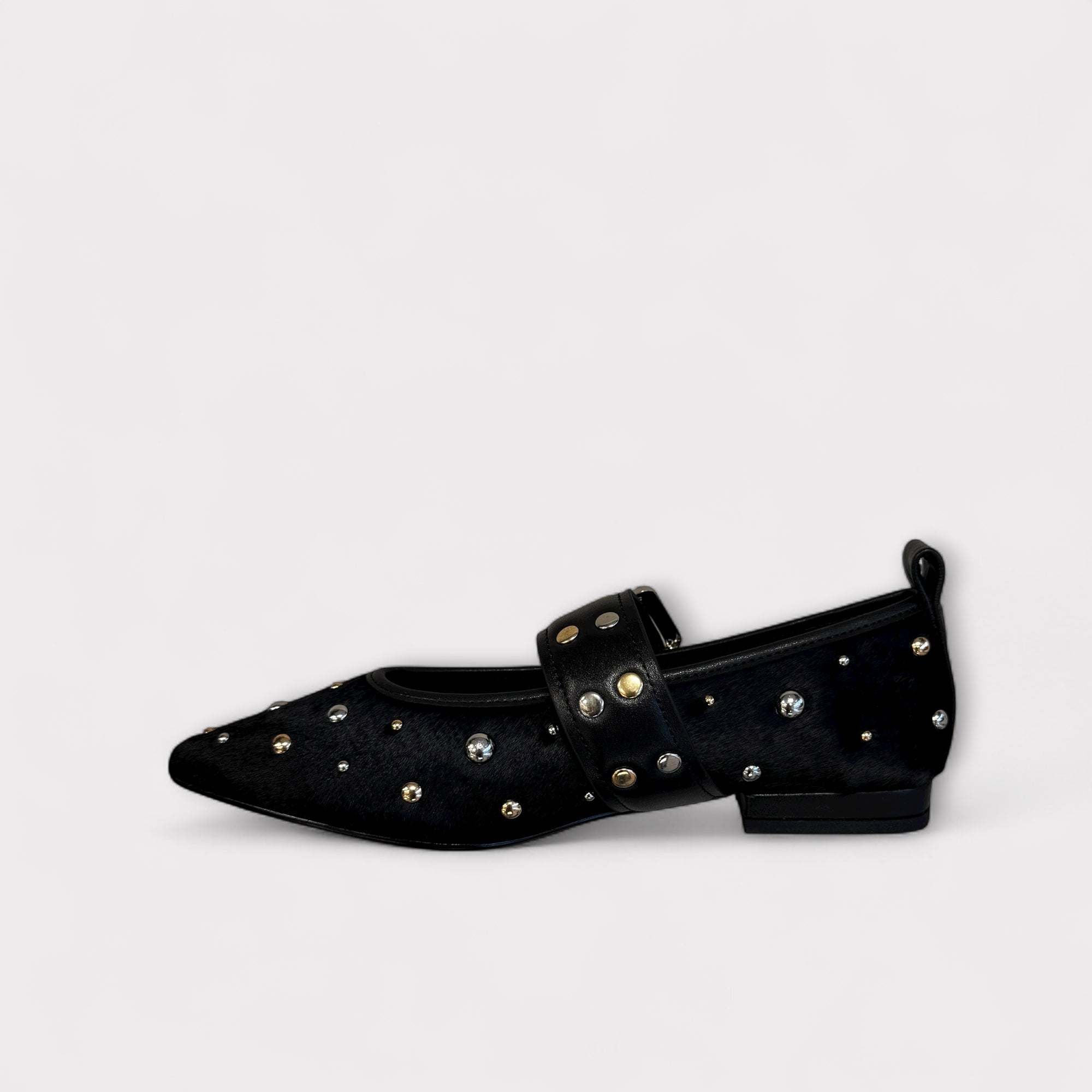 Black pony hair pump with leather trim. Gold and silver studs. Pointed toe with a low heel(2cm).