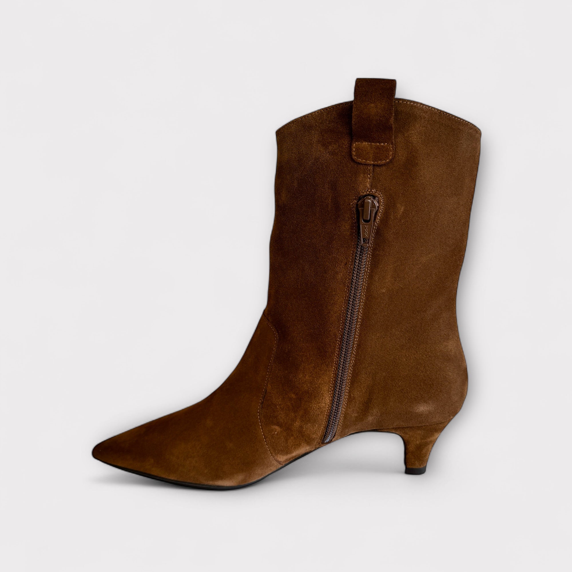 Brown suede boot on a kitten heel. 3/4 side zip opening.