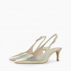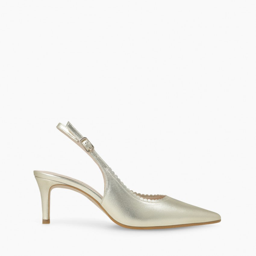 Gold leather slingback with scalloped edge detail.