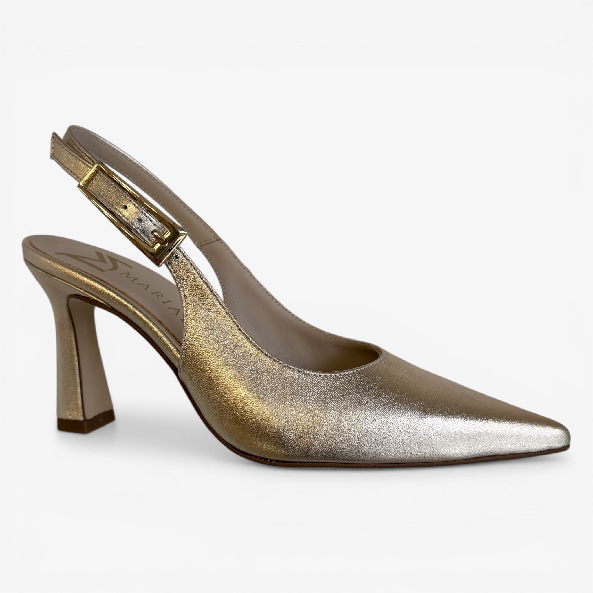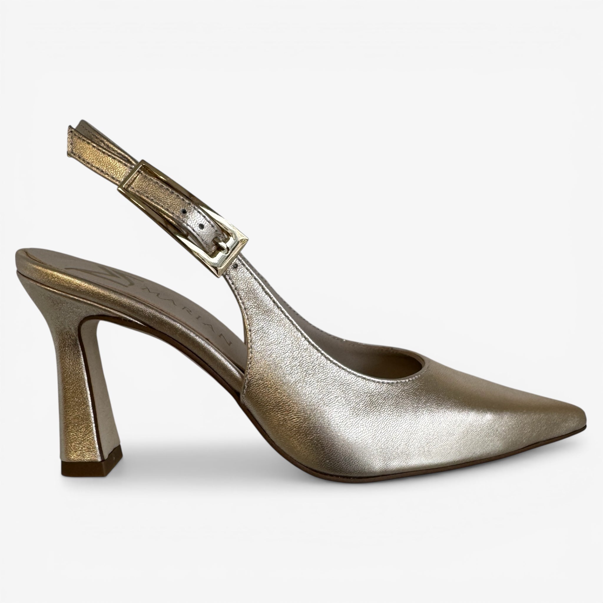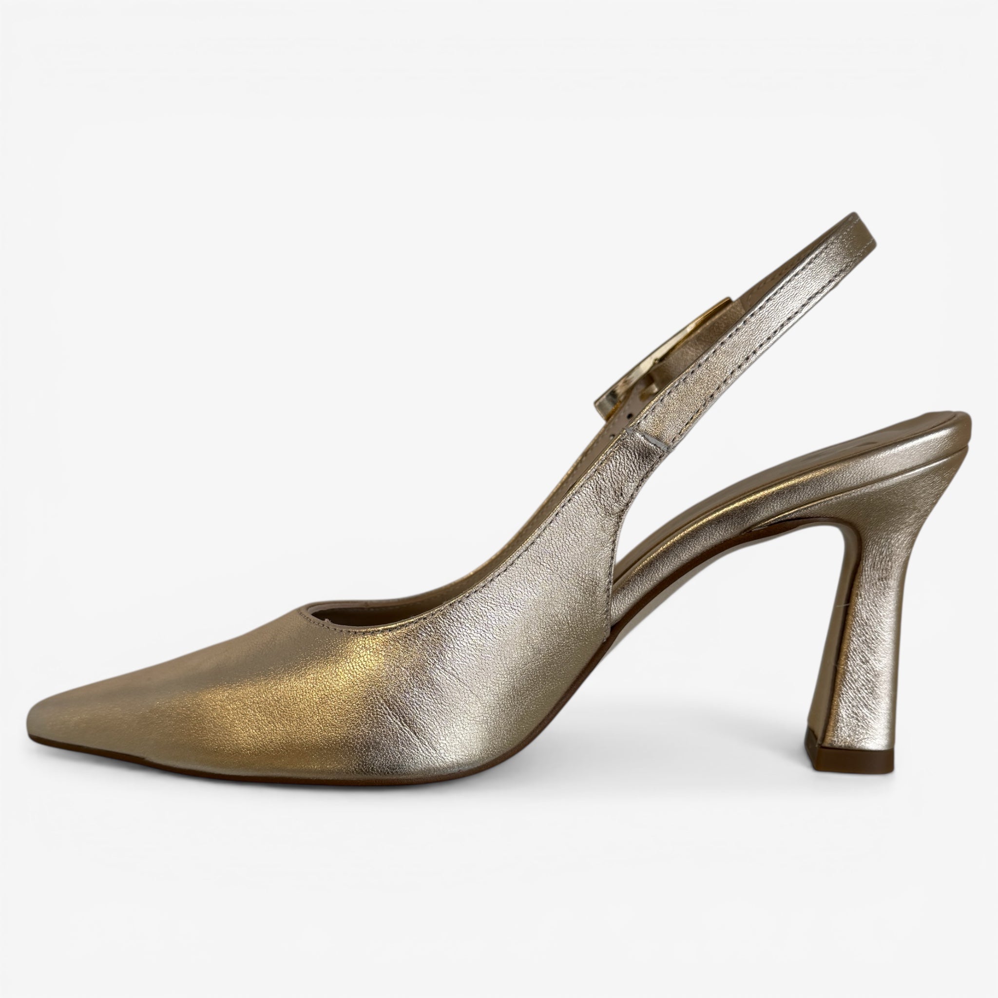 Champagne Gold leather slingback on a geometric heel.